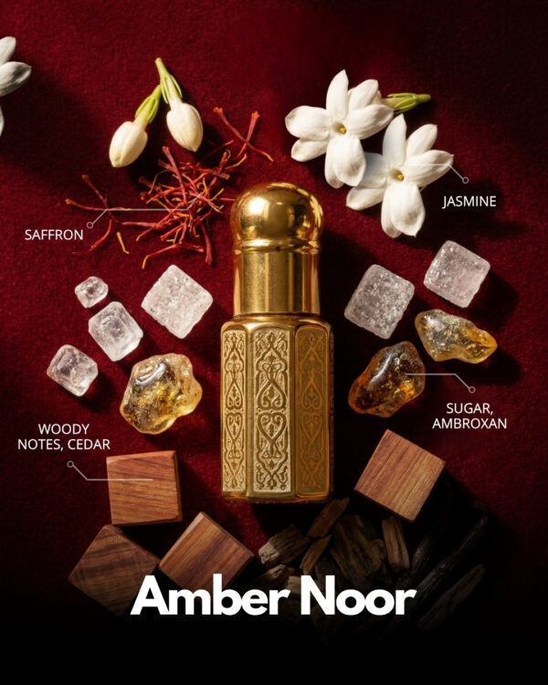 Amber Noor is a fragrance built around balance — where sweetness meets structure, and softness meets strength. It carries a gentle radiance, unfolding slowly and comfortably on the skin.