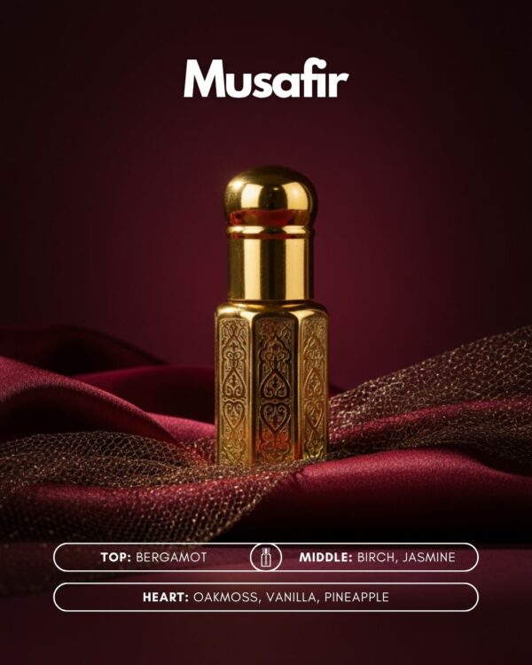 Description: Experience the journey of “Musafir,” a luxurious attar that captures the essence of nature’s finest elements. Crafted for the modern adventurer, this fragrance combines rich top notes, delicate middle notes, and grounding base notes to create an unforgettable scent profile.