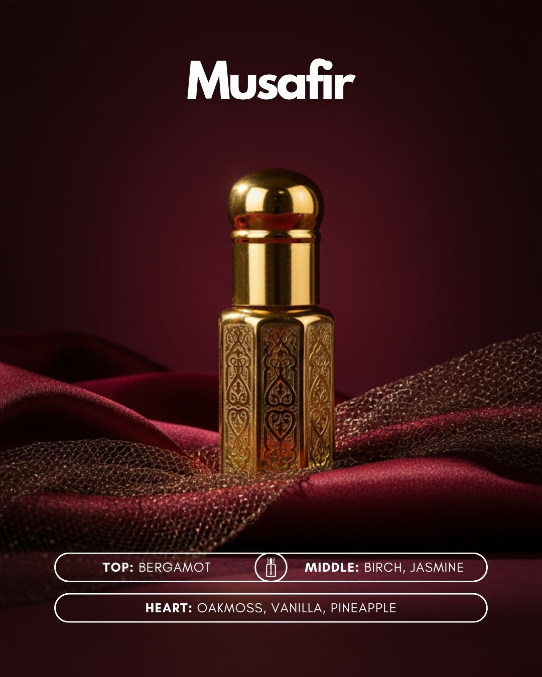 Lifestyle Integration: “Musafir” integrates seamlessly into your daily life, enhancing your natural aura with its captivating scent. Imagine the burst of fresh Black Currant and Bergamot invigorating your morning routine, the soft whispers of Jasmine and Birch accompanying you through the day, and the warm embrace of Oakmoss and Vanilla as you unwind in the evening.